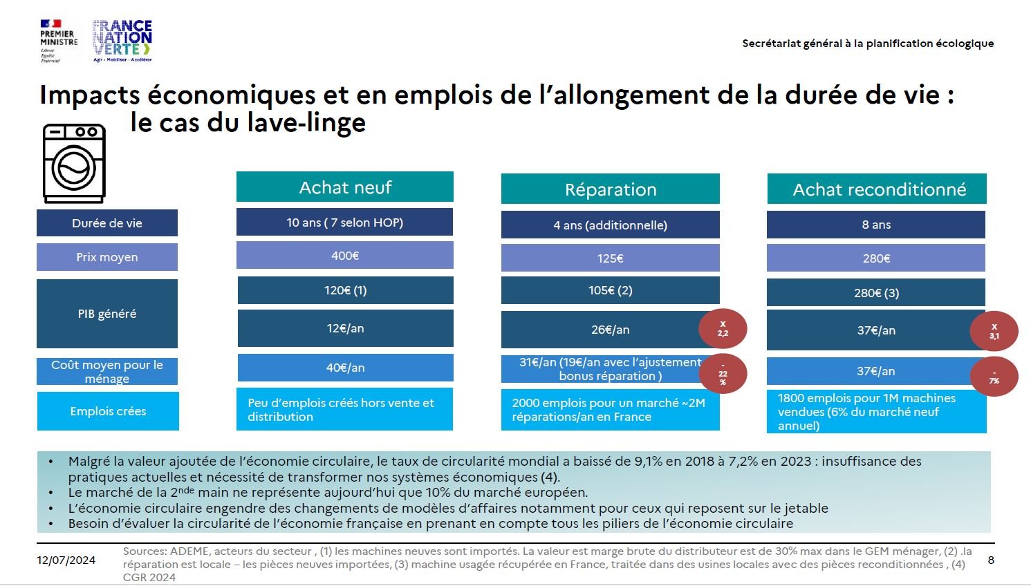 - 70 % de matières premières économisées : Un lave-linge reconditionné consomme 10,5 kg de matières contre 1 800 kg pour un neuf.